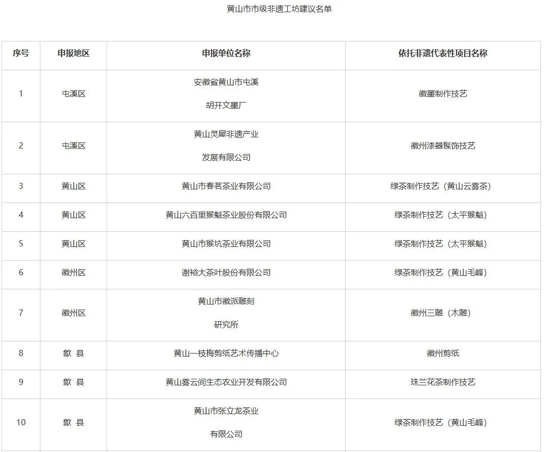 根據(jù)《安徽省文化和旅游廳安徽省人力資源和社會(huì)保障廳安徽省農(nóng)業(yè)農(nóng)村廳關(guān)于印發(fā)<安徽省非遺工坊管理辦法>的通知》要求,市文化和旅游局、市人力資源和社會(huì)保障局、市農(nóng)業(yè)農(nóng)村局聯(lián)合組織開展了市級非遺工坊認(rèn)定工作。經(jīng)申報(bào)主體自愿申請、各區(qū)縣初審?fù)扑]、市級評審復(fù)核,形成市級非遺工坊建議名單,共19家,具體名單如下所示: